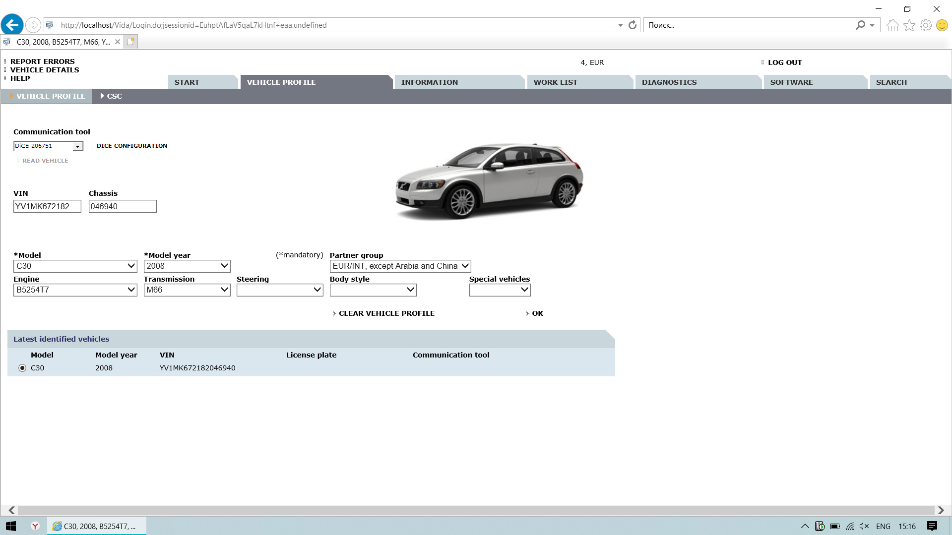 7. Запускаем, пользуемся. Два раза кликаем на иконку VIDA в трее, возможно она у вас будет скрыта, просто нажмите на стрелку вверх возле часов. Если всё ОК, откроется окно Internet Explorer с окном ввода логина, вводим 4 и жмём LOG IN. Далее нажимаем Define Vehicle Profile (или Определить профиль транспортного средства, подключаем Dice и жмем Read Vehicle слева сверху. Если вы всё правильно сделали, то VIDA получит VIN вашей машины через Dice и позволит работать с ним. Можете включать интернет и спокойно устанавливать обновления, драйвера и все другие необходимые вам программы. Лично у меня после этого ничего не сломалось и VIDA стабильно работала.