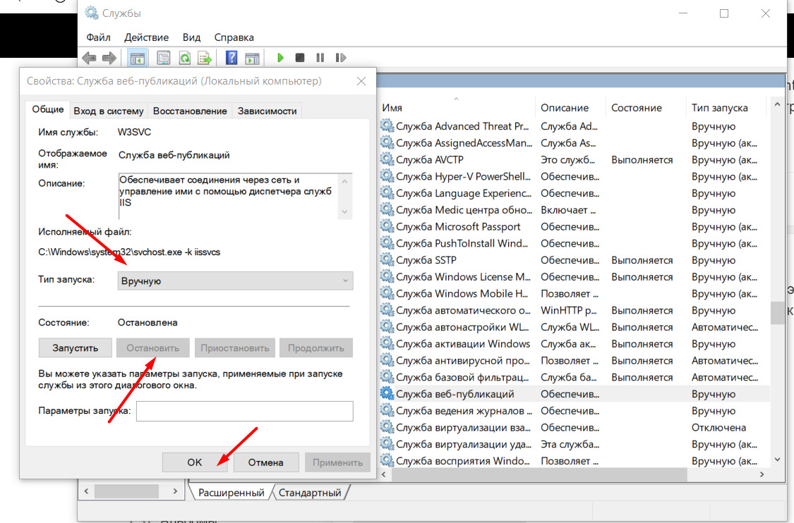 5. Отключаем службу веб-публикаций. Без этого VIDA откажется запускаться, сославшись на занятость 80 порта. Жмём Win+R, вводим services.msc, Enter. Откроется список работающих служб, находим ту, что с именем "Служба веб-публикаций". Правой кнопкой, "Свойства", тип запуска выбираем "Вручную", нажимаем "Остановить", жмём ОК.